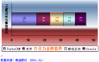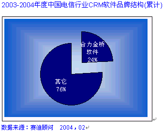 HOLLYCRM(合力金橋軟件)公司作為實(shí)力卓越的CRM主流廠商, 致力于提供最專業(yè)化的應(yīng)用軟件和服務(wù),提供以客戶為核心的信息化解決方案,服務(wù)領(lǐng)域跨越電信運(yùn)營商、金融業(yè)、制造業(yè)等行業(yè)。在電信行業(yè)的CRM市場中,合力金橋軟件處于穩(wěn)固領(lǐng)先位置, 其推出的客戶關(guān)系管理解決方案,覆蓋協(xié)作型、運(yùn)營型和分析型的全部范疇。在CRM產(chǎn)業(yè)在2003年的中國發(fā)展態(tài)勢整體放緩的大環(huán)境下, HOLLYCRM卻一枝獨(dú)秀, 在不到一年的時(shí)間里簽下中國網(wǎng)通總部、天津網(wǎng)通、山西網(wǎng)通、內(nèi)蒙聯(lián)通等大型CRM項(xiàng)目,積累了豐富的CRM項(xiàng)目實(shí)施經(jīng)驗(yàn)。在累計(jì)的電信行業(yè)CRM軟件市場中,合力金橋軟件一家占有份額就達(dá)到24%, 合力金橋軟件此次在CCID年度研究報(bào)告中倍受矚目可謂眾望所歸, 充分說明了其CRM產(chǎn)品在高端行業(yè)的領(lǐng)軍地位, 如圖: