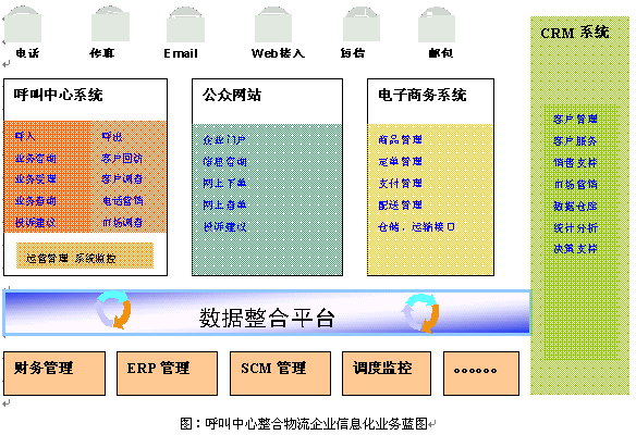 綜上所述,在物流行業(yè)目前的信息化建設(shè)基礎(chǔ)上,以呼叫中心為前端的信息聯(lián)絡(luò)渠道,以電子商務(wù)平臺作為更高級別的系統(tǒng)運(yùn)營支撐,以CRM技術(shù)進(jìn)行客戶管理、分析決策、優(yōu)化流程的手段,整合傳統(tǒng)的物流信息系統(tǒng),將會是一個(gè)更加寬廣的市場!