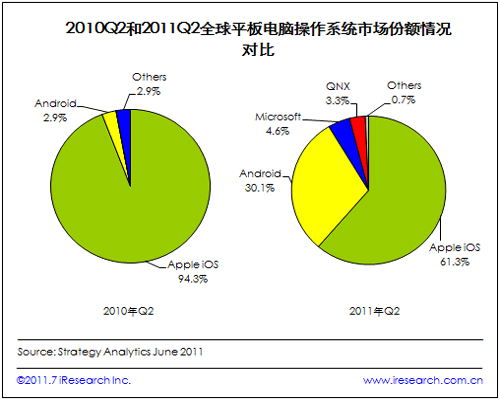 從平板電腦操作系統(tǒng)出發(fā),根據(jù)Strategy Analysis發(fā)布的數(shù)據(jù),2011Q2iOS的市場占比最大,為61.3%,其次為Android,占比為30.1%,windows以4.6%的占比位列第三。在平板電腦上,由于發(fā)展時間較短,競爭格局會比智能手機市場簡單一些。隨著市場的發(fā)展逐漸成熟,可以預(yù)見,iOS的市場份額還將進一步下降,而Android和Windows的市場占比則會上升。