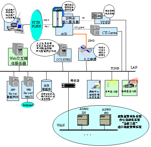 在深圳國稅局方案中,整個系統(tǒng)的建設(shè)按三期規(guī)劃進行。第一期的目標主要是搭建呼叫中心平臺,包括ACD(排隊機)、IVR(交互式語音應(yīng)答系統(tǒng))、CCS(華為呼叫中心中間件)等軟硬件設(shè)備。ACD作為整個系統(tǒng)的核心接入設(shè)備,采用了華為公司的C&C08-Q排隊機。C&C08-Q是大容量高可靠性的數(shù)字排隊機,通過中國七號信令或ISDN