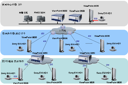 省到17個(gè)地市的二級(jí)網(wǎng)采用: ViewPoint 8650 高清MCU 2臺(tái),用于媒體交換和信令交互。Viewpoint