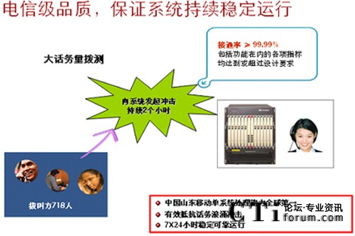 華為聯(lián)絡(luò)中心系統(tǒng)具有高穩(wěn)定性、高可靠性、易擴(kuò)展性和可維護(hù)性。這主要源于華為對(duì)電信網(wǎng)絡(luò)現(xiàn)狀與演進(jìn)的理解,源于華為擁有固定、移動(dòng)和IP三個(gè)網(wǎng)絡(luò)方面綜合實(shí)力。華為數(shù)以千計(jì)的核心平臺(tái)開(kāi)發(fā)測(cè)試人員,幾十種極端環(huán)境(如超大話務(wù)量、溫差、濕度、鹽堿度、缺氧等),磨礪出的是世界級(jí)的高品質(zhì)。麥加朝圣10KM內(nèi)密集200萬(wàn)移動(dòng)用戶,大部分為國(guó)際漫游,整齊劃一的用戶行為,形成連日多波話務(wù)尖峰,網(wǎng)絡(luò)受不均衡沖擊,系統(tǒng)容易雪崩。使用華為方案STC連續(xù)四年征服HAJJ期間話務(wù)高峰,告別系統(tǒng)每逢朝圣就癱瘓歷史。正是繼承了這樣的DNA,我們?cè)谀骋苿?dòng)運(yùn)營(yíng)商聯(lián)絡(luò)中心系統(tǒng)單點(diǎn)實(shí)測(cè)BHCC1200K,每天平均呼叫量為600萬(wàn)次,一套系統(tǒng)支撐著2000多座席和近8000路IVR。