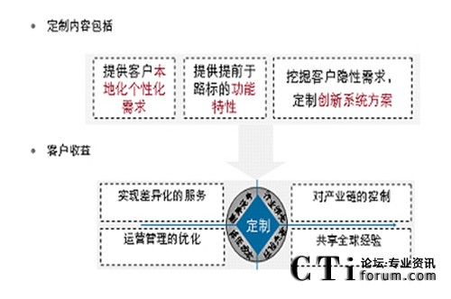 可定制服務(wù)主要體現(xiàn)在三個(gè)層面,一個(gè)是定制化服務(wù),通過(guò)全國(guó)10多個(gè)本地定制開(kāi)發(fā)中心對(duì)客戶提供貼身二次開(kāi)發(fā)服務(wù),支撐客戶更精細(xì)運(yùn)營(yíng)其客服系統(tǒng),另一個(gè)是定制化路標(biāo),定制化創(chuàng)新系統(tǒng)方案,即通過(guò)華為MKT、行銷(xiāo)、開(kāi)發(fā)部門(mén)對(duì)客戶價(jià)值需求的深度分析,將客戶需求去粗存精、去偽存真、由表及里、由此及彼“定制提煉”出來(lái),成為我們產(chǎn)品和方案的路標(biāo)。