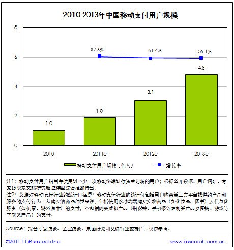根據(jù)艾瑞咨詢統(tǒng)計數(shù)據(jù),2011年中國移動支付用戶規(guī)模將達到1.9億。艾瑞預(yù)計,2013年中國移動支付用戶規(guī)模將達到4.8億。移動網(wǎng)上支付用戶規(guī)模的增長帶動了整個行業(yè)用戶規(guī)模的爆發(fā),另外手機短信支付也在用戶群體中得到了進一步的普及。