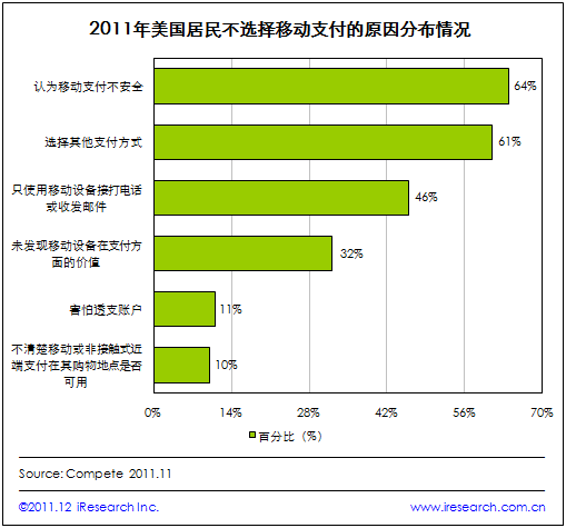 iResearch 艾瑞咨詢整理Compete 的最新數(shù)據(jù)研究發(fā)現(xiàn),在未選擇移動(dòng)支付的美國(guó)居民中,有64%的受訪者認(rèn)為移動(dòng)支付不安全,這成為美國(guó)居民選擇移動(dòng)支付的最大障礙。另有61%的受訪者表示目前仍希望使用其他支付方式,此外還有46%的居民只使用移動(dòng)設(shè)備接打電話或收發(fā)郵件。