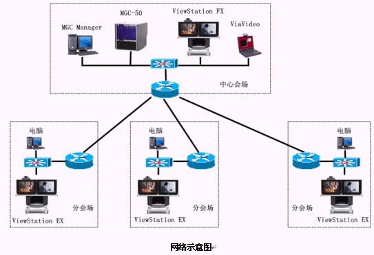 根據(jù)需求及網(wǎng)絡(luò)情況,我們?yōu)樘窖蟊kU建設(shè)基于系統(tǒng)內(nèi)部Intranet的基于H.323標準的視頻會議系統(tǒng)。系統(tǒng)以1個MCU(多點控制單元)為中心,包括1個主會場,13個分會場,10個個人桌面系統(tǒng)。