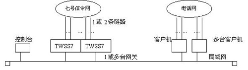 操作系統(tǒng)可以是SCOUNIX ,Windows95/NT。網(wǎng)傳通訊協(xié)議TCP/IP。不同的客戶機(jī)可以運(yùn)行不同的應(yīng)用軟件。七號(hào)控制臺(tái)用于網(wǎng)關(guān)維護(hù)和鏈路管理、參數(shù)設(shè)置等,運(yùn)行于單獨(dú)機(jī)器或某臺(tái)客戶機(jī)上。在簡(jiǎn)單的應(yīng)用中,控制臺(tái)也可以省略。