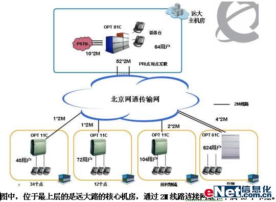 新的網(wǎng)絡(luò)建成以遠(yuǎn)大路中心機(jī)房為核心的星形網(wǎng)絡(luò),租用北京網(wǎng)通2M專線的方式同各個(gè)門(mén)市店連接。各個(gè)門(mén)市店設(shè)立了自己的程控交換機(jī),并通過(guò)E1中繼方式和核心機(jī)房實(shí)現(xiàn)全網(wǎng)互聯(lián)。在此方案中,所有的市話呼入和呼出都通過(guò)核心節(jié)點(diǎn)同網(wǎng)通之間的中繼通道,從而實(shí)現(xiàn)大中電器內(nèi)部話音通訊的統(tǒng)一編號(hào)方案、統(tǒng)一撥號(hào)規(guī)則、統(tǒng)一維護(hù)和管理;并對(duì)外公布公開(kāi)和便于記憶的號(hào)碼,以配合網(wǎng)點(diǎn)的促銷活動(dòng),以及未來(lái)客戶服務(wù)等應(yīng)用的擴(kuò)展。