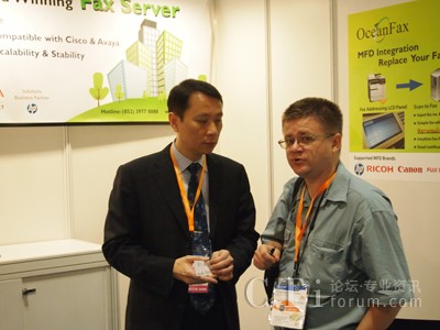圖:傲訊全通CEO謝昭興先生(左)向來訪買家介紹OceanFax傳真服務(wù)器的最新功能