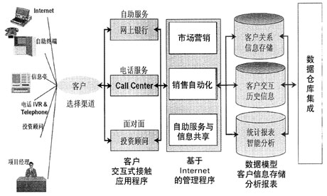 針對商業(yè)銀行面臨的挑戰(zhàn)和真實(shí)的需要,Oracle開發(fā)了面向銀行業(yè)的CRM解決方案。該解決方案提供全方位、統(tǒng)一的多渠道協(xié)同的客戶交互服務(wù)入口,包括網(wǎng)上自助服務(wù)、網(wǎng)上他助服務(wù)(通過Call Center在線指導(dǎo)客戶理財(cái)或提供投資建議)、電話自助服務(wù)、電話專家服務(wù)、電話智能市場推銷和銷售等,F(xiàn)場服務(wù)則提供客戶經(jīng)理與客戶面對面交流的能力,包括知識(shí)共享(金融市場信息、銀行產(chǎn)品信息和各業(yè)務(wù)部門發(fā)布的信息等)、銀行信息的及時(shí)獲取、產(chǎn)品和服務(wù)介紹、適時(shí)的投資建議、客戶交易行為追蹤、通過智能化工具提供專家服務(wù)、銷售機(jī)會(huì)管理等,允許重點(diǎn)客戶通過Web、電話或與客戶經(jīng)理/投資顧問面談等方式,提供更靈活的服務(wù)選擇和更及時(shí)的服務(wù),以保留大客戶群,增長股東利益。