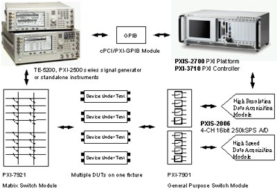 PXI控制器并搭載了Pentium III處理器。使用者可以自眾多PXI訊號產(chǎn)生模塊選擇所需,或搭配外接式儀器透過PXI-GPIB控制卡聯(lián)機。被測物(DUT)產(chǎn)生的特性參數(shù)、傳遞函數(shù)或時域信號,可采用PXI-2000、TE-6100等高性能數(shù)據(jù)擷取卡進行采樣。而后藉由ADLINK