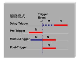 edge)觸發(fā)或是下降緣(falling)觸發(fā),另外,在觸發(fā)的模式上也有幾種不同的區(qū)別,分別是延遲觸發(fā)(delay-trigger)、預(yù)觸發(fā)(pre-trigger)