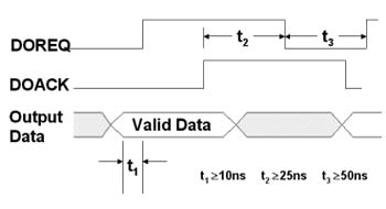 mode),相較于序列式的數(shù)據(jù)傳輸,并行傳輸提供了簡(jiǎn)單且更高速的數(shù)據(jù)傳輸方式,不過(guò)其技術(shù)關(guān)鍵在于發(fā)送端與接收端之間的時(shí)序差問(wèn)題,因此,針對(duì)此時(shí)序差的問(wèn)題,高速數(shù)字I/O卡需提供握手模式,讓兩張卡以交握信號(hào)確保數(shù)據(jù)的正確性。下圖為數(shù)據(jù)輸出的時(shí)序圖: