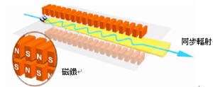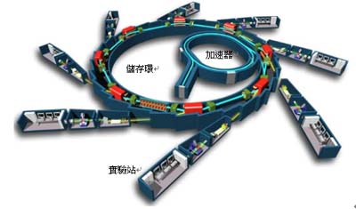 同步輻射(synchrotron radiation)是由以近光速行進的電子束在受外在偏轉磁鐵的磁力改變運動方向時所發(fā)射的電磁波。同步加速器的結構包含電子槍或離子源、線型加速器、偏轉磁鐵、真空腔、RF腔、實驗站等。電子或離子首先由電子槍或離子源激發(fā)產(chǎn)生,經(jīng)直線加速器加速到接近光速,再通過輸送管道進入儲存環(huán)。儲存環(huán)是由許多磁鐵組成。粒子在儲存環(huán)旋轉處受到偏轉磁鐵作用發(fā)生偏轉,并在直線段持續(xù)加速以保持動能,并在儲存環(huán)中作回旋運動,同時不斷發(fā)出同步光。光束路線將同步光從儲存環(huán)引導出來,憑借內(nèi)部精密的光學組件將同步光聚焦并選取合適波段的同步輻射送入實驗站?茖W研究人員在實驗站測量同步輻射經(jīng)過物體反射、衍射、散射及透射后的光譜或是探測物體被光子激發(fā)出的電子、離子等,來研究物體的結構性能,探索微觀世界的奧秘。