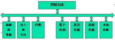 同步輻射設備以系統(tǒng)分類可分為磁鐵系統(tǒng)、電源系統(tǒng)、高頻系統(tǒng)、注入與引出系統(tǒng)、電子冷卻系統(tǒng)、內(nèi)靶系統(tǒng)、真空系統(tǒng)、束流診斷系統(tǒng)、控制系統(tǒng)、準直與測量系統(tǒng)。系統(tǒng)架構圖如下: