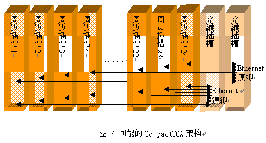 系統(tǒng)所使用的電路板成本、降低提供備援系統(tǒng)插槽(system slot)的復雜性,以及增加插槽總數(shù)。圖4顯示可能的CompactTCA系統(tǒng)范例。