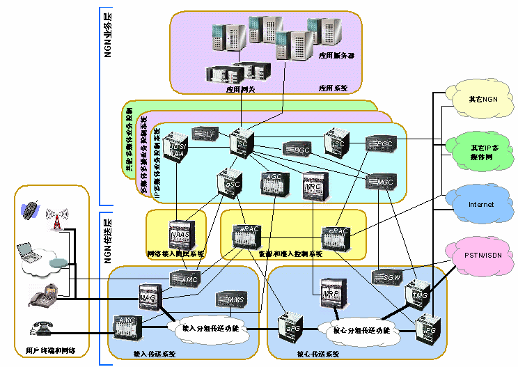 NGN提供多媒體會話和非會話的,交互型的和非交互型的、單播的和多播的業(yè)務(wù)。NGN的業(yè)務(wù)和控制將隨業(yè)務(wù)的發(fā)展提供多種業(yè)務(wù)和控制子系統(tǒng)。NGN的基本能力是IP多媒體業(yè)務(wù)控制子系統(tǒng)。IP多媒體業(yè)務(wù)控制是以SIP為基礎(chǔ)的,支持移動和固定業(yè)務(wù)的融合,支持與現(xiàn)有固定和移動網(wǎng)絡(luò)的互操作。它包括會話控制,注冊,業(yè)務(wù)級的鑒權(quán)和授權(quán)功能。它還包括特殊媒體控制,互通控制等功能。