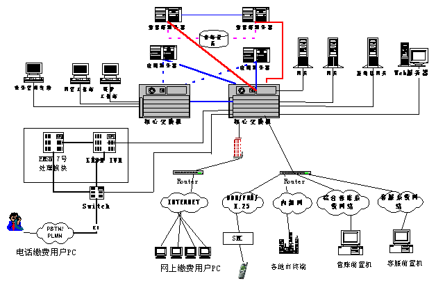 根據(jù)公司業(yè)務系統(tǒng)的組網方式,提供合適的解決方案,滿足需求,采用全省集中方式,具有以下特點:省中心建設語音處理系統(tǒng)和付費平臺業(yè)務系統(tǒng)集中在省中心;完全集中管理;完全支持全省漫游繳費;全省設備投資較少。