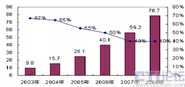 圖1-1 2004-2008年中國BSM軟件市場規(guī)模與增長趨勢數據(數據來源:賽迪顧問)
