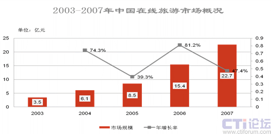 根據(jù)Iresearch的數(shù)據(jù),2007年,中國在線旅游市場規(guī)模達到22.7億元,比06年同比增長47.5%;其中攜程以56.3%的市場份額繼續(xù)領(lǐng)跑,比06年的54.2%增長了2個百分點。與此相對比的是,美國三強旅游網(wǎng)站之一的Travelocity,在06年第一季度的全球營收就達到了24億美金。具體情況如下圖所示:
