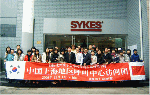2006年12月14日上午,韓國光州女子大學(xué)呼叫市場營銷系30多名大學(xué)學(xué)生 在鄭成教授等的帶領(lǐng)下,專程來滬參觀訪問賽科斯(Sykes)公司。韓國光州女子大學(xué)是韓國第一個(gè)設(shè)立呼叫市場營銷專業(yè)的大學(xué),該專業(yè)為四年制本科,學(xué)生畢業(yè)后主要從事客戶服務(wù)行業(yè)的基層管理崗位工作。