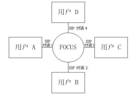 緊耦合會議的邏輯架構圖如圖三所示。會議中的核心是"會議中心(conference focus)",每一個會議都有一個會議中心,由一個URI標識,用戶通過聯(lián)系這個URI參加到一個會議中去。會議中心和用戶之間的拓撲結構為星性結構。會議中心為用戶提供并維持一個信令連接,并且可以執(zhí)行會議策略,實現(xiàn)對會議的控制和管理。