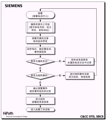 C&CC是西門子指揮控制中心全面解決方案的核心。C&CC以有線(HiPath 4000)/無線(模擬和數(shù)字集群)通訊平臺為信息采集和資源調(diào)度基礎,系統(tǒng)核心模塊包括:融合多種業(yè)務的接處警工作流,面向地理信息對象的資源管理,面向事件的案情與錄音管理,基于預案的輔助決策支持,以及多種統(tǒng)計、查詢和報表生成工具等。在此基礎上,C&CC還提供豐富的接口,確保與技防報警、圖像/視頻監(jiān)控和GPS