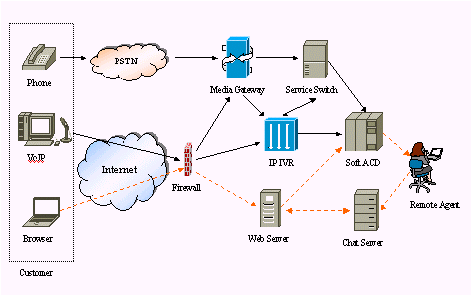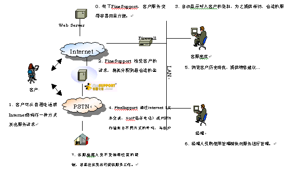 FineSupportTM網(wǎng)通呼叫中心解決方案主要由以下幾個部分組成:Media Gateway(接受來自IP網(wǎng)的網(wǎng)絡(luò)電話、傳統(tǒng)電話等呼叫,傳送給軟交換系統(tǒng))、Service Switch(軟交換系統(tǒng),負(fù)責(zé)呼叫控制)、IP IVR(存儲顧客呼叫信息,播放語音提示信息)、Soft ACD(呼叫分配服務(wù)器,可定制多種分配策略)、Web Server(負(fù)責(zé)報表管理、站點管理和監(jiān)控、FAQ存儲管理、留言及文本交談管理等)、Chat Server(建立交談通道)、Remote Agent(坐席工作站。通過客戶端軟件進(jìn)行客服支持)。