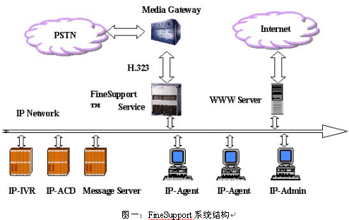 Finesupport是一個完全基于IP網絡的呼叫中心,不同于智能網應用或CTI應用。其應用建立在Soft Switch體系之上,媒體流總是在第一時間被報文化,成為數據流,此后整個應用系統(tǒng)中處理的完全是數據,主要通過軟件來實現,因而在降低成本、開展新業(yè)務、平滑升級方面具有極大的優(yōu)勢。