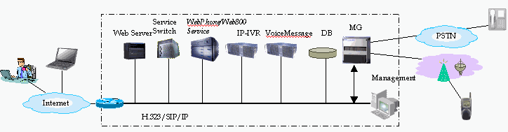 Web800電信級(jí)解決方案為電信運(yùn)營(yíng)商以ASP的模式運(yùn)營(yíng)800業(yè)務(wù)提供了良好的解決途徑。該方案要求電信運(yùn)營(yíng)商安裝Web800 Server、媒體網(wǎng)關(guān)、數(shù)據(jù)庫(kù)等系統(tǒng)核心部件、AAA Server,挑選IP IVR等作為可選部件。Web800無(wú)需更新原有的系統(tǒng)設(shè)施,就可與傳統(tǒng)的800號(hào)業(yè)務(wù)進(jìn)行融合;系統(tǒng)在完成遠(yuǎn)程的IP網(wǎng)絡(luò)傳輸過(guò)程后,經(jīng)過(guò)IP網(wǎng)關(guān),即接入原有傳統(tǒng)800系統(tǒng),將遠(yuǎn)程呼叫擴(kuò)展為基于Web的呼叫方式,同時(shí)又保護(hù)電信運(yùn)營(yíng)商的原有投資,使之延續(xù)。 該方案具有電信級(jí)的高性能指標(biāo):同時(shí)在線最大人數(shù)為10000人/臺(tái);語(yǔ)音質(zhì)量介于固定電話和移動(dòng)電話之間;服務(wù)器無(wú)故障運(yùn)行時(shí)間<5天/年等。系統(tǒng)還具有專(zhuān)門(mén)的運(yùn)營(yíng)商管理功能,通過(guò)Web頁(yè)面即可進(jìn)行系統(tǒng)管理、呼叫記錄統(tǒng)計(jì)等。
