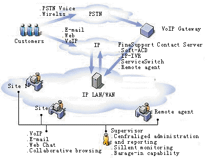 FineSupport發(fā)揮了軟交換和VoIP技術(shù)的優(yōu)勢(shì),并融合了Internet的特性,使顧客與呼叫中心之間不僅可以通過(guò)語(yǔ)音進(jìn)行通信,還可以通過(guò)電子郵件、傳真、文字交談進(jìn)行通信,甚至可以實(shí)現(xiàn)在線(xiàn)推送網(wǎng)頁(yè)、在線(xiàn)網(wǎng)頁(yè)導(dǎo)航等業(yè)務(wù)。呼叫中心的客服人員只需具備一臺(tái)多媒體電腦和一副耳麥,即可向顧客提供完備的服務(wù)。