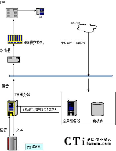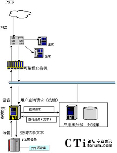 在技術(shù)上,用戶可以通過電話提交他的查詢請求(比如使用按鍵方式),IVR服務(wù)器收到請求后會(huì)向其他應(yīng)用服務(wù)器提交此查詢請求,當(dāng)IVR得到查詢結(jié)果后,他會(huì)將文本形式的查詢結(jié)果交給jTTS服務(wù)器,jTTS服務(wù)器會(huì)返回查詢結(jié)果的語音形式,最終語音會(huì)在坐席上播放,用戶就可以聽到他剛才所要查詢的信息。(如圖所示)