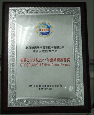 CTI論壇(ctiforum)1月4日消息(記者 張潔): 近日,由CTI論壇主辦的2011年度“編輯推薦獎”評選結(jié)果正式揭曉,捷通華聲語音合成技術(shù)產(chǎn)品榮獲CTI論壇2011年度編輯推薦獎。