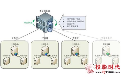 用戶、會議、服務器的管理工作都放在中心服務器來進行,將會議功能和管理功能分離。用戶的登錄會議、管理系統(tǒng)只要訪問一個中心服務器即可,簡化了用戶操作,并降低系統(tǒng)風險。