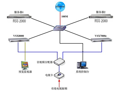應(yīng)急備份 :此系統(tǒng)中服務(wù)器1和服務(wù)器2互為備份;VSX8000和VSX7000e互為備份。RSS2000分配公網(wǎng)IP以便用戶通過(guò)互聯(lián)網(wǎng)接收直播和點(diǎn)播,兩臺(tái)服務(wù)器的地址同時(shí)發(fā)布在網(wǎng)站上。