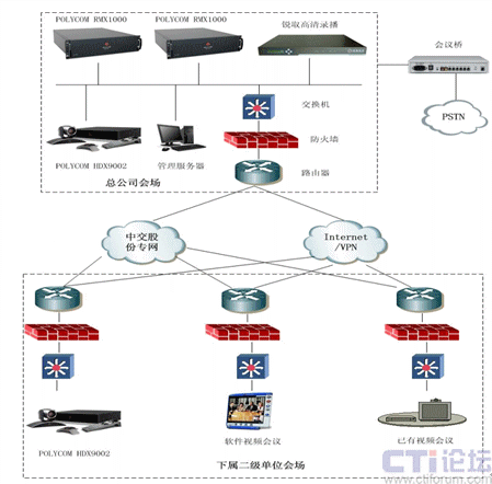 1000和HDX 8000在與原有標清系統(tǒng)的協(xié)作、互通中,表現(xiàn)的游刃有余,高清、標清和純語音客戶端都可以自由接入。系統(tǒng)的穩(wěn)定和強大的兼容性,讓中交集團非常滿意,決定采用寶利通的產(chǎn)品組合建設集團的高清視頻系統(tǒng)。這也是2008年中央企業(yè)的第一套全國骨干網(wǎng)高清視頻會議系統(tǒng)。