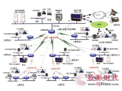圖中 PathNavigator 為 Polycom 的專業(yè)網(wǎng)閘軟件系統(tǒng)。支持分層級聯(lián),支持雙機熱備。除具備網(wǎng)閘的終端注冊、地址解析及帶寬管理基本功能外,還具有轉(zhuǎn)移呼叫、費用優(yōu)化等高級網(wǎng)絡(luò)控制功能。