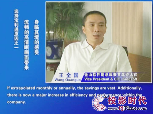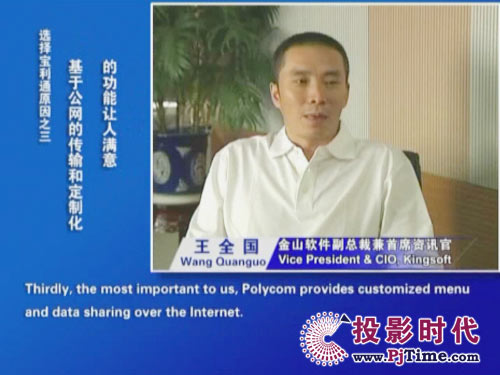 金山軟件副總裁兼首席資訊官王全國(guó)先生說(shuō)道:“對(duì)于軟件行業(yè)來(lái)說(shuō),及時(shí)、高效的溝通是保持競(jìng)爭(zhēng)優(yōu)勢(shì)的重要前提。相比之前使用的標(biāo)清產(chǎn)品,寶利通高清視頻會(huì)議系統(tǒng),提供了完全不同的體驗(yàn),流暢的高清晰畫面猶如真實(shí)的面對(duì)面溝通。而且我們公司并沒(méi)有申請(qǐng)專線,所有的應(yīng)用都是基于公網(wǎng)實(shí)現(xiàn)的。另一方面,新型全中文定制菜單的運(yùn)用,令我們使用起來(lái)非常方便,這更提高了我們使用視頻通信手段實(shí)現(xiàn)異地溝通的熱情!