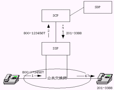 該圖示業(yè)務(wù)工作過程如下:(1)主叫用戶撥800號號碼,(2)SSP向SCP查詢800號號碼,(3)SCP查詢數(shù)據(jù)庫后向SSP送回譯碼結(jié)果(真正被叫號碼),(4)SSP連接主、被叫,振鈴。