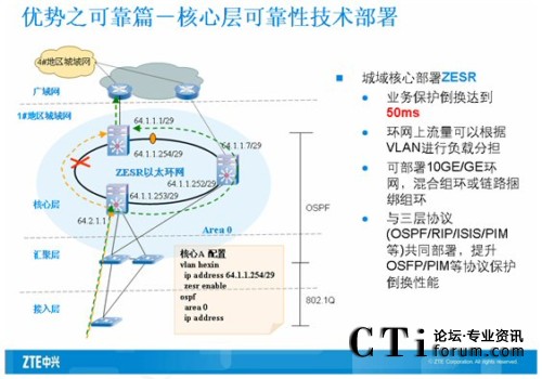 核心交換機主要是匯聚下行的全千兆智能路由交換機,所以要求設備提供高密度板卡和線速轉發(fā)的能力。同時保證對下行端口進行帶寬控制,中興采用萬兆路由交換機ZXR10 8905來滿足用戶的需求。ZXR10 8900系列萬兆路由交換機是中興通訊推出的新一代的大容量核心/匯聚路由交換機系列產(chǎn)品,主要定位于運營商IP城域網(wǎng)、校園網(wǎng)、電子政務網(wǎng)和大型企事業(yè)網(wǎng)等網(wǎng)絡的核心/匯聚層。ZXR10 8900系列萬兆路由交換機基于先進的模塊化理念進行設計,并采用了基于多處理器并行處理機制和Crossbar空分交換結構的體系結構,關鍵模塊均采用可以1:1進行冗余備份。ZXR10 8900系列具備10GE、GE、FE等各種豐富的接口模塊,并全面支持IPv4、IPv6、組播、QOS、帶寬控制等業(yè)務功能。ZXR10 8900系列整個系統(tǒng)所具備的高可靠性、高擴展性、良好的業(yè)務能力等特點,可以滿足各種網(wǎng)絡核心/匯聚層的建設需求。