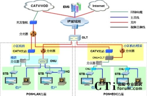 其中,xPON+EoC解決方案專門針對老小區(qū)或五類線無法入戶小區(qū)。該方案采用頻分復用技術,可實現(xiàn)有線電視射頻信號和以太網IP數(shù)據(jù),在一根同軸電纜內同時傳輸,充分利用已有的同軸電纜資源,混合信號在客戶端進行分離,射頻信號連接至電視機或數(shù)字機頂盒,IP 數(shù)據(jù)信號連接至電腦,最終實現(xiàn)HFC雙向化改造及寬帶接入。配合雙向互動機頂盒,廣電能提供交互電視、視頻點播等多種增值業(yè)務。更重要的是,該方案能夠實現(xiàn)xPON設備和EoC設備的統(tǒng)一管理,對設備、業(yè)務帶寬及網絡帶寬進行適配與管理,確保業(yè)務質量,做到可管到戶、可控到戶、可控到每個業(yè)務,大大降低廣電的管理和運維成本,提升廣電的服務能力,為實現(xiàn)全國有線電視網絡統(tǒng)一規(guī)劃、統(tǒng)一建設、統(tǒng)一運營、統(tǒng)一管理奠定結實的基礎。