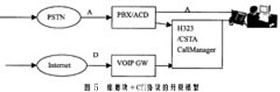 比較有代表性的解決方案有兩種,一種是效仿圖1的做法,在ACD的用戶側加入VoIP網(wǎng)關,再統(tǒng)一接入(如圖4所示);另一種方法是采用價格比較便宜的IP座席卡,并在Call Manager中加入CTI的有關協(xié)議模塊(如圖5所示)。