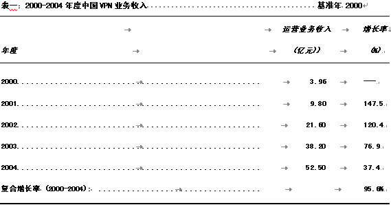 2000年,中國VPN運營業(yè)務收入為人民幣3.96億元,主要業(yè)務提供商為新興的電信運營商如網通、吉通、聯通等公司,以及數量可觀的或明或暗的網絡公司,VPN用戶主要集中在規(guī)模較大的外企、金融領域以及與IT相關的企業(yè)之中。隨著更多的虛擬運營商進入VPN服務市場,以及企業(yè)成本意識的不斷增強,VPN用戶群體已經呈擴散之勢,制造業(yè)、FMCG連鎖經營業(yè)、酒店業(yè)等已經迅速進入這一市場。預計到2004年度,國內VPN業(yè)務收入可以達到52.5億元人民幣,年復合增長率為95.6%。各年度測算數據見表一。