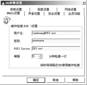 IM和E-mail是我們?cè)诰W(wǎng)上最常用的兩種工具,如今不少IM軟件將兩者作了完美的結(jié)合。在QQ中你可以直接給自己的好友發(fā)郵件,而無(wú)須再輸入E-mail地址;此外對(duì)于自己的信箱QQ還有檢查新郵件功能,在“系統(tǒng)參數(shù)”中設(shè)置您自己的E-mail,填好POP3地址,您可以選擇定時(shí)檢查時(shí)間,QQ就會(huì)自動(dòng)檢查有否新郵件到達(dá)。對(duì)于MSN