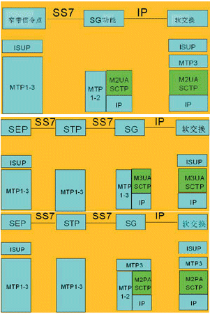從圖中可以看出,軟交換和信令網(wǎng)關(guān)功能使用M3UA協(xié)議,軟交換只須具備MTP3以上層次的窄帶協(xié)議。信令網(wǎng)關(guān)功能則必須實(shí)現(xiàn)MTP1、2、3層。信令網(wǎng)關(guān)在M3UA方式下即可充當(dāng)信令代理(信令網(wǎng)關(guān)和軟交換共享信令點(diǎn)碼),也可以用信令轉(zhuǎn)接點(diǎn)(STP)方式轉(zhuǎn)接信令(信令網(wǎng)關(guān)擁有自己獨(dú)立的信令點(diǎn)碼)。