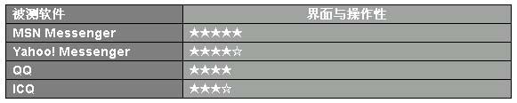 對于IM類軟件來說,網友希望其界面在精美的同時越簡單越直接越好。在這一點上,MSN Messenger最為突出,界面精致,操作極易上手,在本次評測中獲得一致認可,位列第一;Yahoo! Messenger操作上也比較直觀,只是“做工”顯得有些粗糙;被測的QQ2003剛剛在界面上做了重大的改變,只是稍顯零亂,對MSN的部分借鑒比較成功,對于一個新用戶來說最基本的功能的使用還算方便;ICQ功能的確強大,界面有些老舊,(ICQ Lite可以改變這一切,但是ICQ Lite僅僅是ICQ的一個插件版本,本次評測沒有考慮),ICQ操作對中文用戶來說也過于繁復。