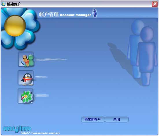 先添加相應(yīng)的賬戶;點擊"添加新賬戶"按鈕,彈出"賬戶管理"頁面,在"服務(wù)類型"的下拉列表中選擇相應(yīng)的服務(wù)類型,再依次輸入用戶名和密碼;設(shè)定完成后點擊"保存"即完成新賬戶的添加;保存完畢后myim自動返回登錄界面。