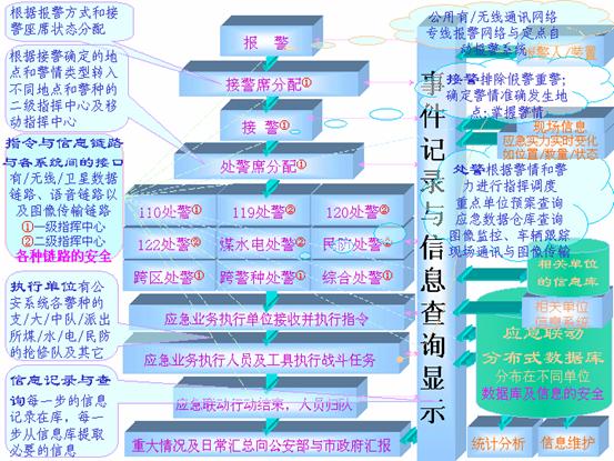 根據(jù)接過來的警情,應(yīng)急聯(lián)動系統(tǒng)向處置力量部門發(fā)出指令派出處置力量編組到現(xiàn)場,并根據(jù)現(xiàn)場反饋回來的信息,決定是否增援或歸隊。事件記錄通過局域網(wǎng)被送到相應(yīng)的處警員終端,處警員通過計算機輔助調(diào)度系統(tǒng)查詢相關(guān)資料,制定反應(yīng)措施,并向相關(guān)聯(lián)動單位發(fā)出具體調(diào)度指令。在緊急事件發(fā)生時,相應(yīng)的電子預(yù)案會被觸發(fā)啟動。如果發(fā)生了重大災(zāi)難,險情或特殊的事件,則可以啟用城市緊急狀態(tài)指揮室,由首長進行統(tǒng)一指揮。