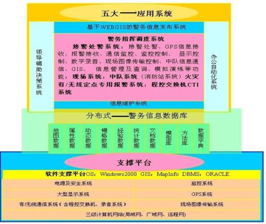 支撐平臺有計算機網(wǎng)絡(luò)系統(tǒng)、監(jiān)控系統(tǒng)、顯示系統(tǒng)、GPS系統(tǒng)、有/無線通信系統(tǒng)、圖像傳輸系統(tǒng)、電源及機房、軟件支撐平臺等。其中,計算機網(wǎng)絡(luò)系統(tǒng)包括指揮中心、二級指揮中心與移動指揮中心、業(yè)務(wù)執(zhí)行機構(gòu)(如:應(yīng)急中隊、派出所等)之間的三級計算機網(wǎng)絡(luò),即指揮中心局域網(wǎng)絡(luò)、業(yè)務(wù)機關(guān)網(wǎng)絡(luò)、與分支機關(guān)的廣域網(wǎng)絡(luò)、與移動指揮中心的遠程訪問網(wǎng)絡(luò)。指揮中心與二級指揮中心、分支機構(gòu)、移動中心之間有語音通信、數(shù)據(jù)通信,指揮中心與移動中心有語音通信、數(shù)據(jù)通信(無線)、現(xiàn)場圖像傳輸;指揮中心與公安其它機構(gòu)通過撥號網(wǎng)絡(luò)訪問(內(nèi)網(wǎng)),指揮中心與普通老百姓通過撥號網(wǎng)絡(luò)訪問(外網(wǎng))。