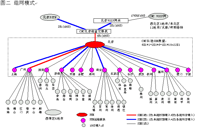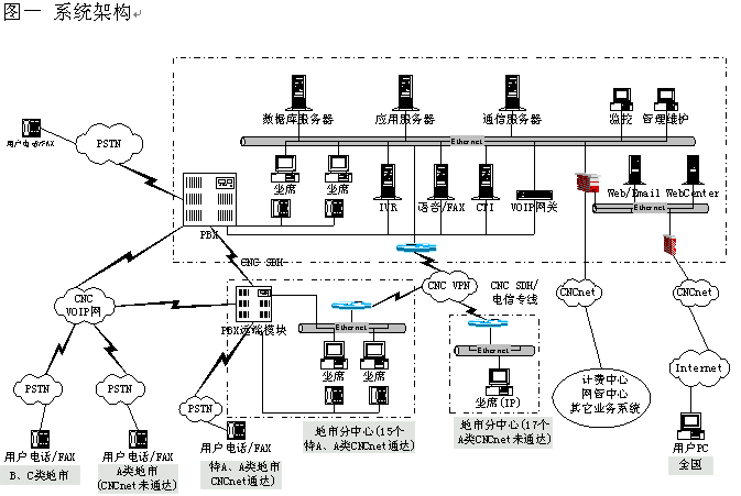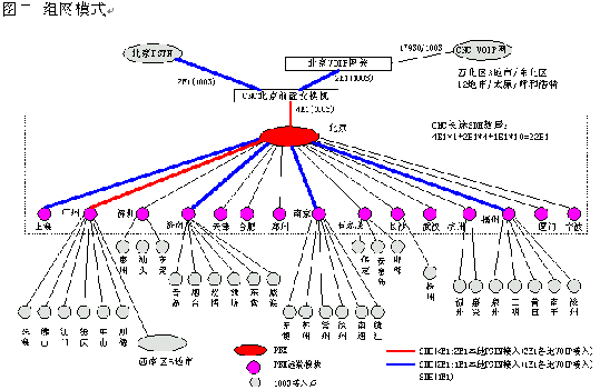 網(wǎng)通的客戶服務(wù)系統(tǒng)(1003呼叫中心)包括位于北京總部的總中心及其它全國30多個城市的分中心,全國范圍共有近200個接入點(diǎn)(覆蓋城市),共有200余座席,由總中心,交換機(jī)遠(yuǎn)端模塊接入點(diǎn)子中心及軟覆蓋接入點(diǎn)組成的三層架構(gòu)。參見下圖一《系統(tǒng)架構(gòu)》及圖二《組網(wǎng)模式》。